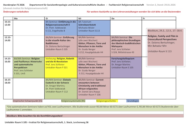 BITTE BEACHTEN: ab HS2022 gilt für die Neustudierenden der neue Studienplan! Bei Fragen wenden Sie sich bitte an die Studienfachberatung des Instituts. BITTE BEACHTEN SIE BEI DER ANMELDUNG IM KSL: Die religionssystematischen Seminare haben auf KSL zwei Laufnummern. Alle Studierende ausser RELWI Minor 60 ECTS über Laufnummer 0, RELWI Minor 60 ECTS Studierende über Laufnummer 1 anmelden. Bitte überprüfen Sie nochmals die Form der Durchführung der Lehrveranstaltung und die Raumangaben vor dem Sitzungstermin. Aenderungen vorbehalten
